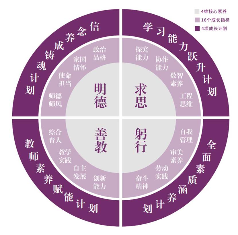 “四维核心素养”:书院明确师范生“明德、求思、躬行、善教”四维核心素养,每维素养下设四个成长指标(共16个)为师范生自身成长核验提供坐标指引,同时为书院育人活动设计提供目标框架。