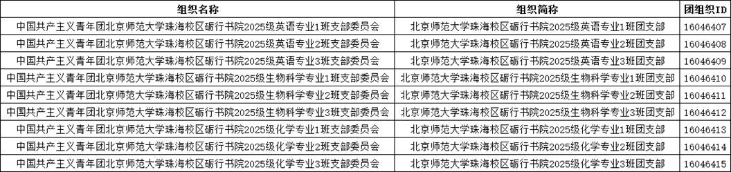 新生班级团支部全称及组织ID详见下表: